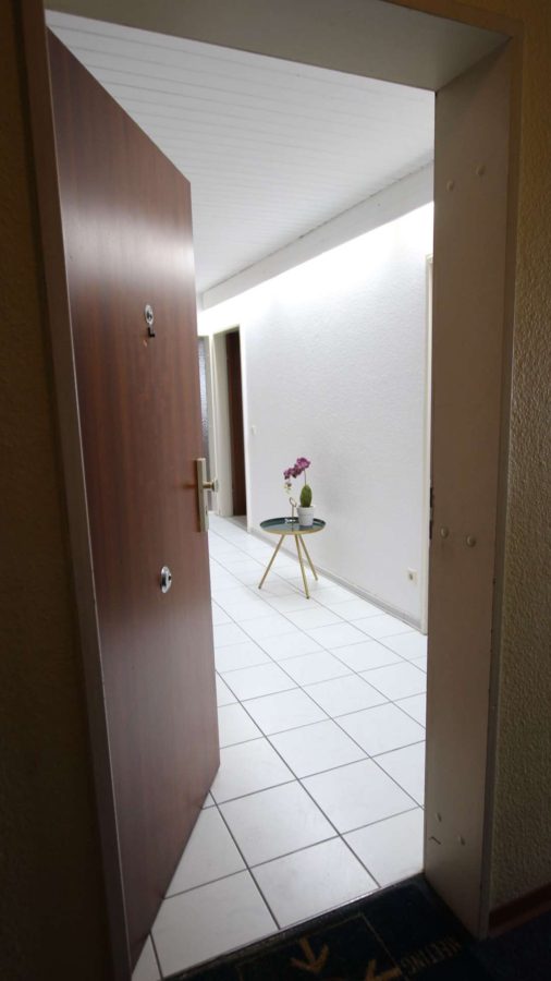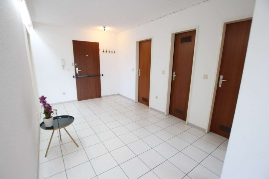 Ein gut bemaßter Eingangsbereich, weiß gefliest, vermittelt ein luftiges sowie angenehmes Raumklima und bietet viel Stellfläche für Ihr Mobiliar, Bücherwände oder eignet sich auch für einen schönen Essbereich.