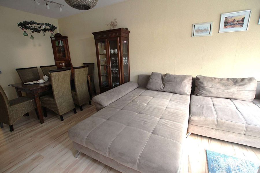 Sehr hell präsentiert sich ein 27 m²großes Wohnzimmer mit komfortablem Essbereich, welches über eine raumbreite Fensterfront verfügt und den Raum mit viel Tageslicht durchflutet.