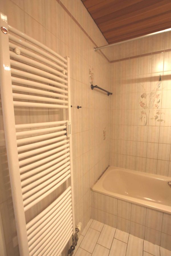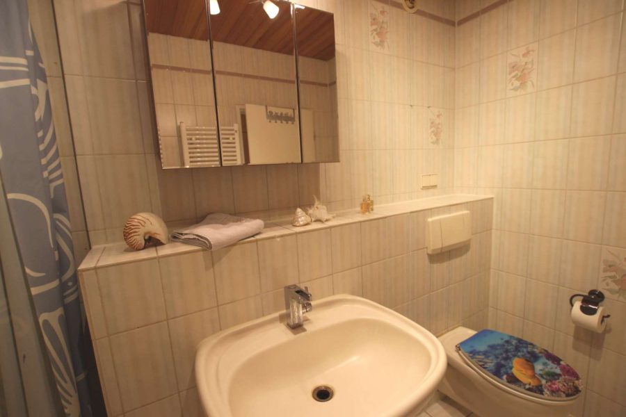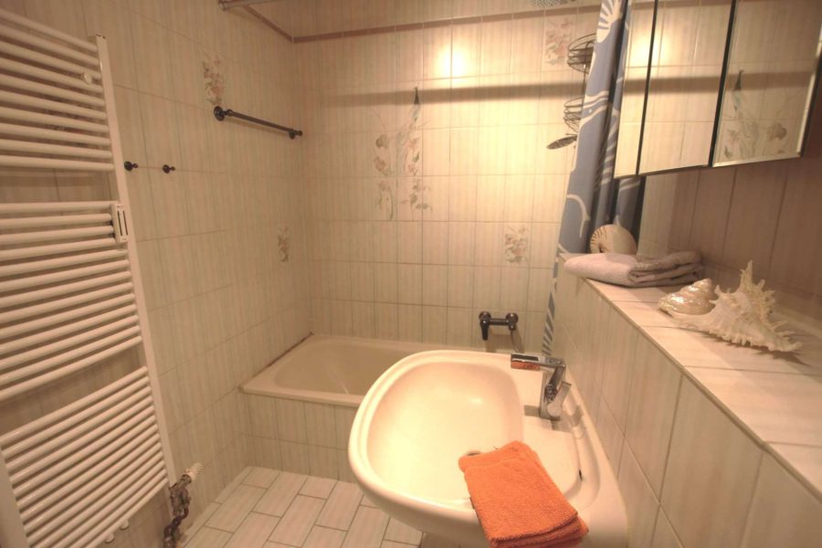 Von hier aus gelangt man über die geräumige Diele sowohl in die beiden Schlafbereiche als auch in einen kleinen Flur und in das geschmackvolle sowie hellbeige geflieste Bad, das mit Badewanne, Waschtisch, Handtuchheiztrockner u. WC ausgestattet ist.