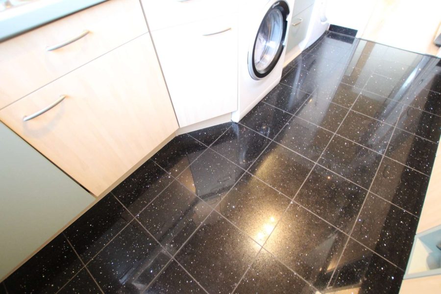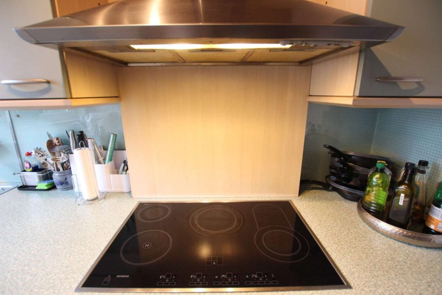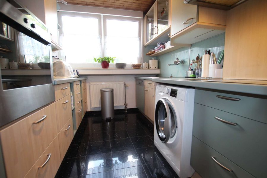 Gegenüber befindet sich die Küche, die beidseitig installiert, vom Schreiner angefertigt und technisch komplett ausgestattet, ein zentraler Treffpunkt für die Familie sein wird.