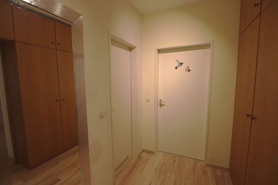 Praktische Einbau-Garderobenschränke fügen sich passend in die dafür vorgesehenen Nischen im kleinen Flur ein.