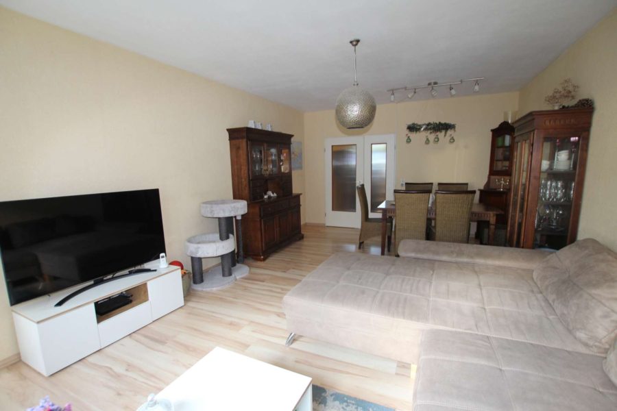 Sehr hell präsentiert sich ein 27 m²großes Wohnzimmer mit komfortablem Essbereich, welches über eine raumbreite Fensterfront verfügt und den Raum mit viel Tageslicht durchflutet.
